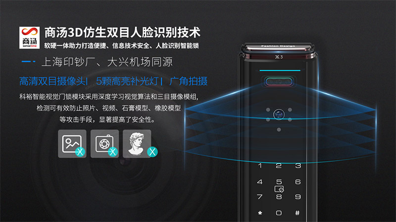 X3是科裕與商湯科技共同打造的新款人臉識別智能鎖,在信息安全上有更大的提升,采用了 3D 仿生雙目紅外攝像頭架構(gòu)實現(xiàn)立體成像,結(jié)合商湯先進的活體檢測算法,有效地防止照片、視頻、人像、人皮面具等假面識別開門,大大地提升了用戶安全性。